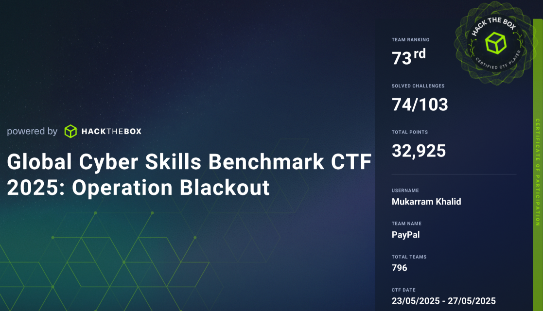 I recently teamed up with my colleagues at PayPal for the Hack The Box Business CTF - Global Cyber Skills Benchmark CTF 2025 - Operation Blackout. This post covers a few of the interesting challenges I solved.