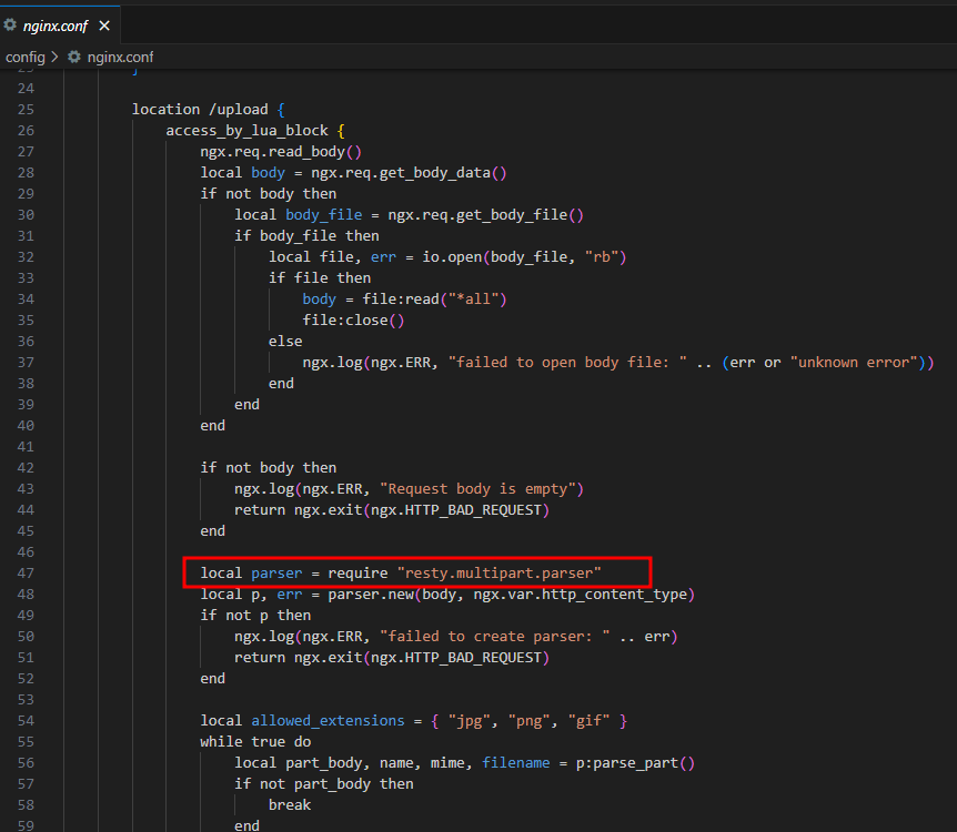 The Nginx config uses lua-resty-multipart-parser to validate uploaded file extensions.