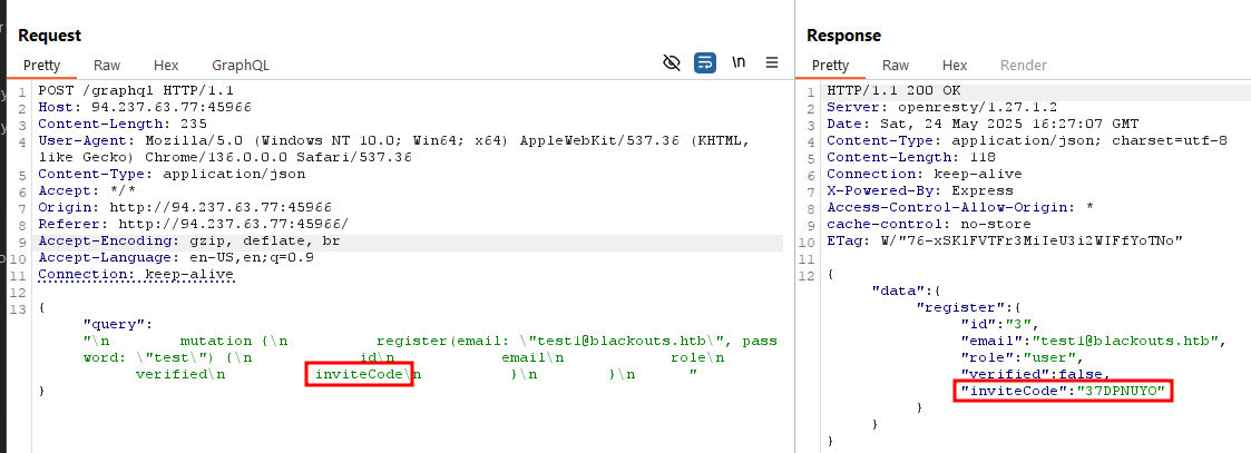 The register mutation returns the invite code in the response if we include the inviteCode field in the GraphQL request. This allows us to verify our account easily.