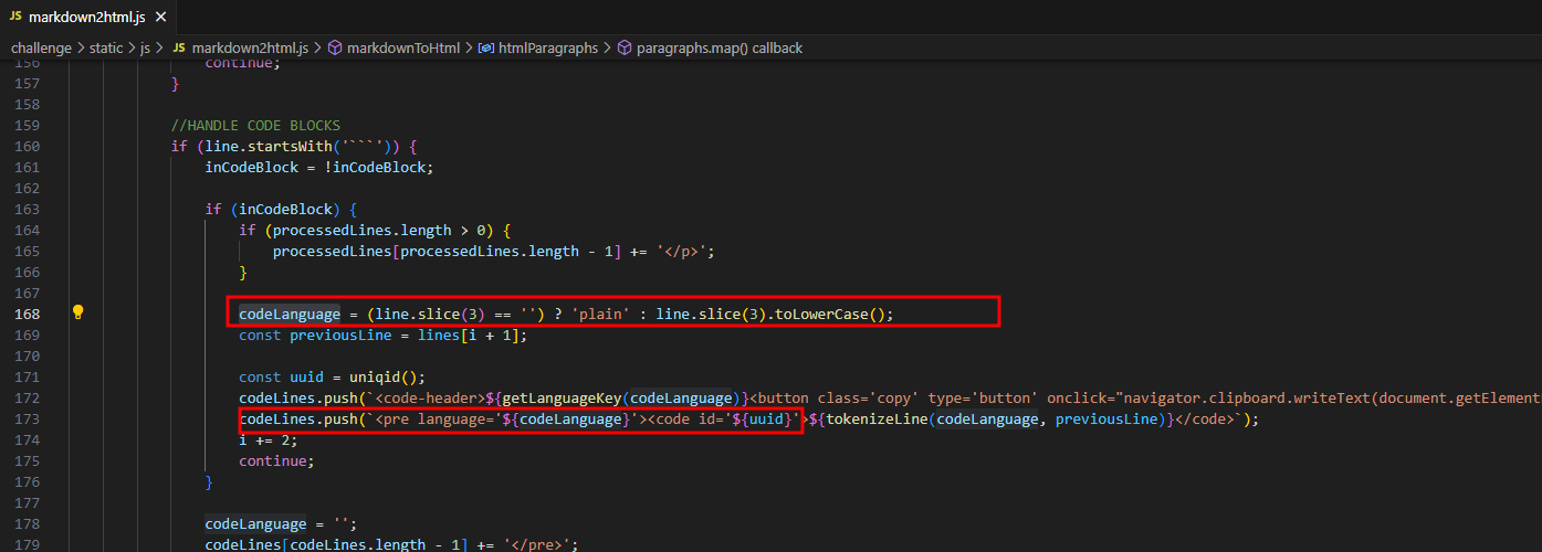 Looking at markdown2html.js, I found a tricky XSS in the code block’s markdown, specifically using attributes on the pre tag.