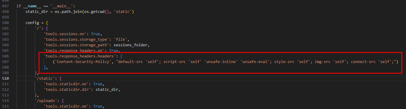 1 2 3 4 5 6 7 8 9 10 11 12 13 14 15 16 17 18 19 config = { '/': { 'tools.sessions.on': True, 'tools.sessions.storage_type': 'file', 'tools.sessions.storage_path': sessions_folder, 'tools.response_headers.on': True, 'tools.response_headers.headers': [ ('Content-Security-Policy', "default-src 'self'; script-src 'self' 'unsafe-inline' 'unsafe-eval'; style-src 'self'; img-src 'self'; connect-src 'self';") ], }, '/static': { 'tools.staticdir.on': True, 'tools.staticdir.dir': static_dir, }, '/uploads': { 'tools.staticdir.on': True, 'tools.staticdir.dir': uploads_dir, } }In our config, we are setting the sessions to