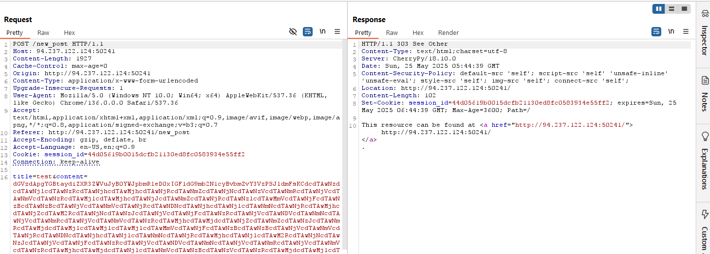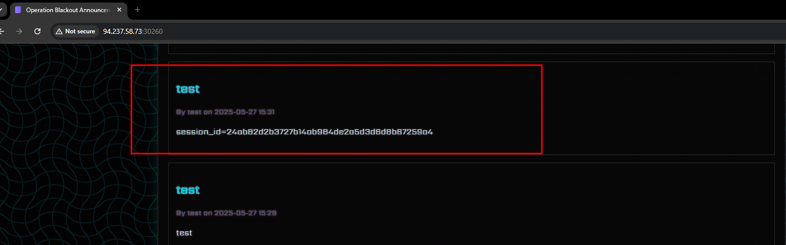 We can bypass this by setting a session cookie for our own user in the XSS payload. The payload will grab the admin’s cookie, overwrite the cookie to our user session, and create a blog post as our user—posting the admin’s cookie in the content.