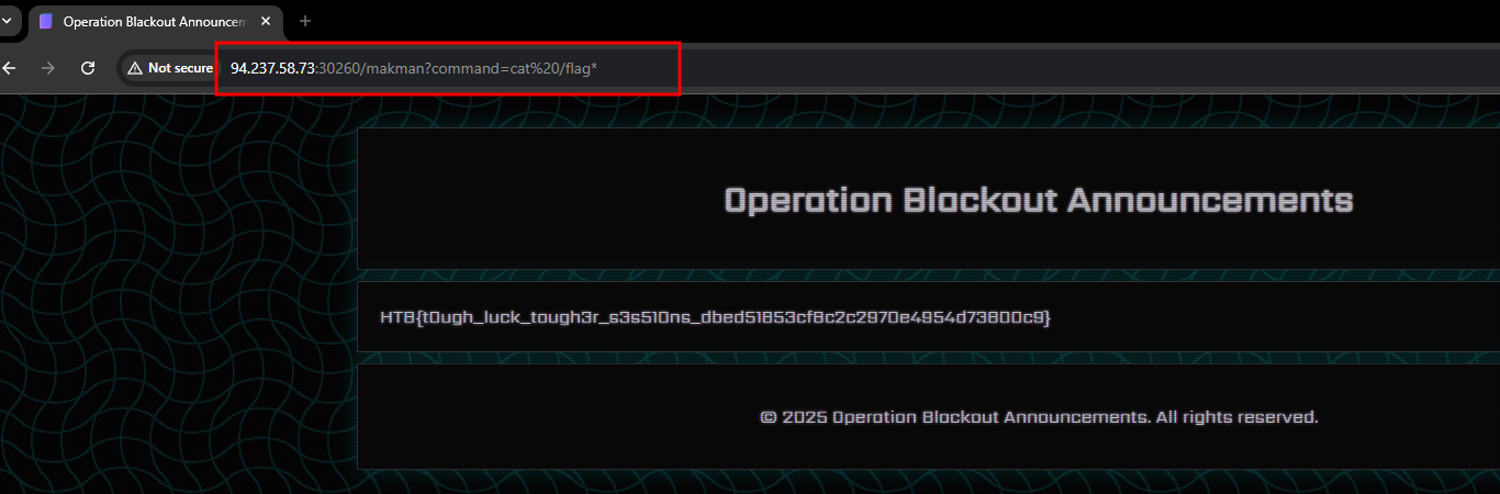 1 2 3 4 5 6 7 8 9 10 11 12 13 14 15 16 17 18 19 20 21 22 23 24 25 26 27 28 29 30 31 32[05/Jan/2025:14:17:25] HTTP Traceback (most recent call last): File "/usr/local/lib/python3.11/site-packages/cherrypy/_cprequest.py", line 659, in respond self._do_respond(path_info) File "/usr/local/lib/python3.11/site-packages/cherrypy/_cprequest.py", line 718, in _do_respond response.body = self.handler() ^^^^^^^^^^^^^^ File "/usr/local/lib/python3.11/site-packages/cherrypy/lib/encoding.py", line 223, in __call__ self.body = self.oldhandler(*args, **kwargs) ^^^^^^^^^^^^^^^^^^^^^^^^^^^^^^^^ File "/usr/local/lib/python3.11/site-packages/cherrypy/_cpdispatch.py", line 54, in __call__ return self.callable(*self.args, **self.kwargs) ^^^^^^^^^^^^^^^^^^^^^^^^^^^^^^^^^^^^^^^^ File "/app/app.py", line 88, in admin username = cherrypy.session.get('username') ^^^^^^^^^^^^^^^^^^^^^^^^^^^^^^^^ File "/usr/local/lib/python3.11/site-packages/cherrypy/lib/sessions.py", line 362, in get self.load() File "/usr/local/lib/python3.11/site-packages/cherrypy/lib/sessions.py", line 287, in load if data is None or data[1] < self.now(): ~~~~^^^ TypeError: 'int' object is not subscriptable [05/Jan/2025:14:17:25] HTTP Request Headers: Remote-Addr: 172.17.0.1 HOST: 127.0.0.1:1337 USER-AGENT: python-requests/2.25.1 ACCEPT-ENCODING: gzip, deflate ACCEPT: */* CONNECTION: keep-alive COOKIE: session_id=injected Content-Length: 0However, it will also trigger the RCE, which causes the flag file to be moved to a static folder we can access.