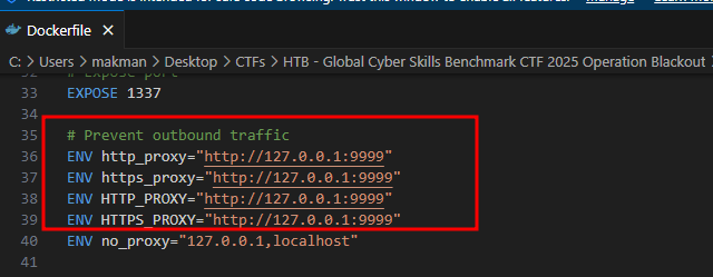 Dockerfile, we see the env variables for HTTP proxying are set. This means that any HTTP request made by the admin bot will usehttp://127.0.0.1:9999as a proxy, but since that port has nothing running on it the request will simply fail, so it is impossible to use HTTP for exfiltration on the remote instance.