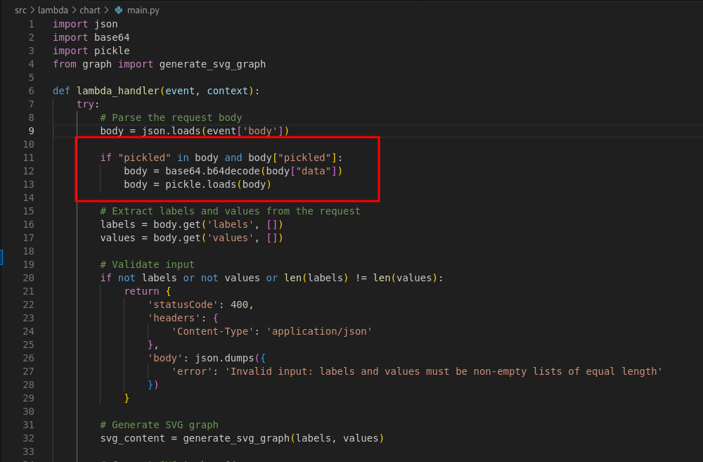 I dumped the source code using git-dumper. The dumped code contained a Lambda function vulnerable to pickle deserialization.