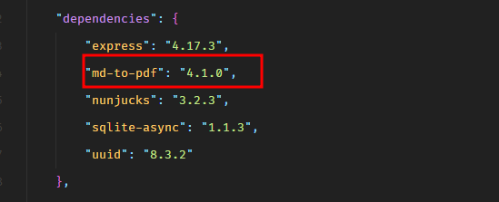 We have the source code of the challenge. The first thing to notice is that in package.json, it uses md-to-pdf version 4.1.0.