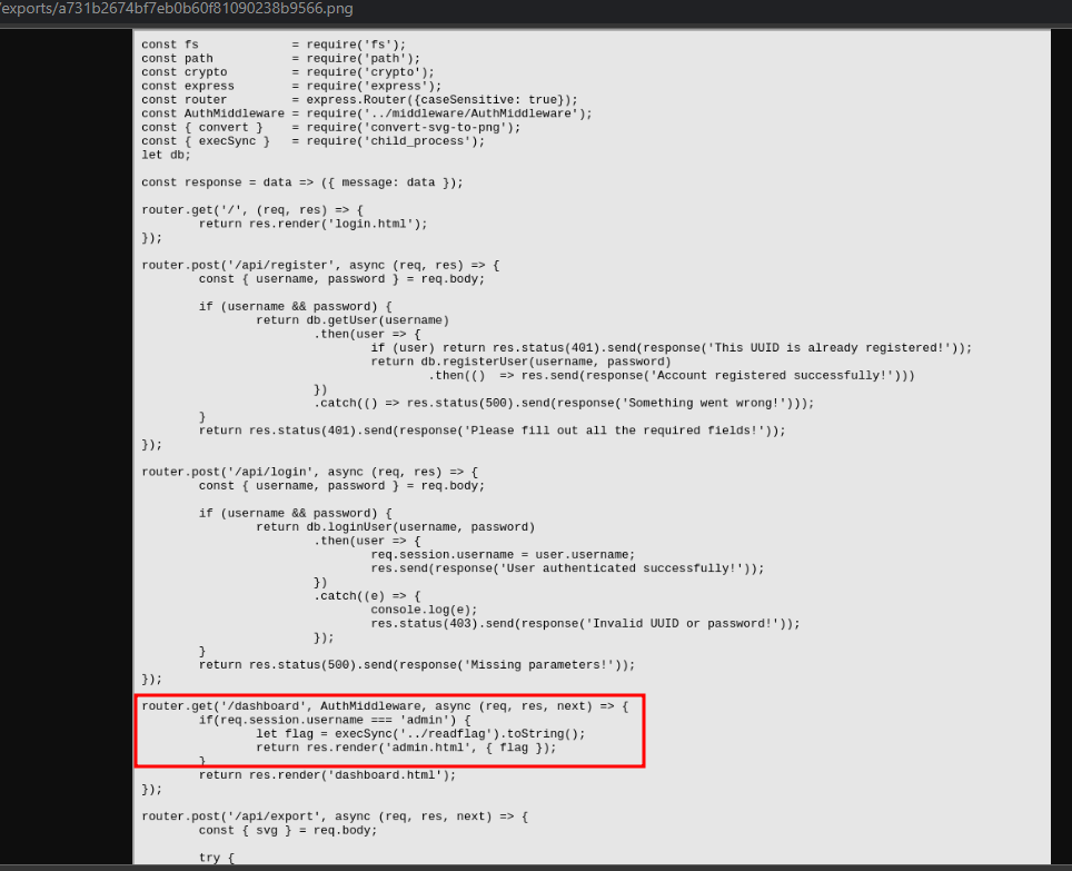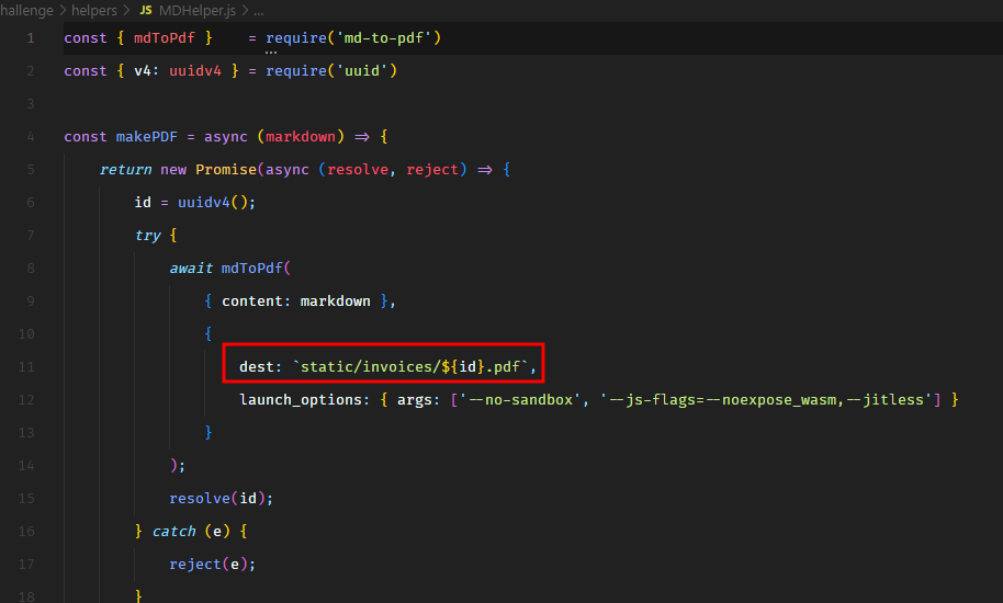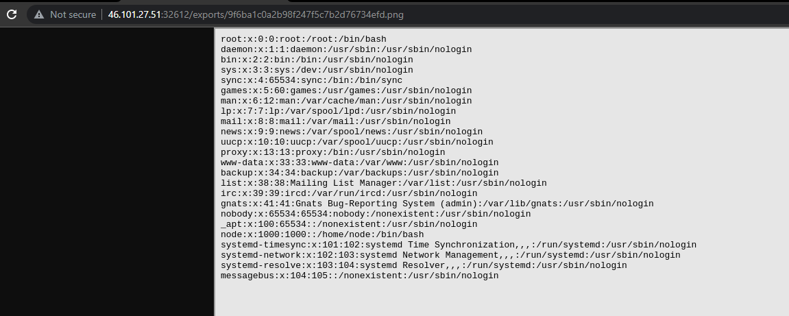 After a few hits and trials, it seems like we cannot get a reverse shell. However, we can read our flag and write the output somewhere which can be accessed over the public URL. In the code, we see it’s writing PDF files to a directory accessible over HTTP.