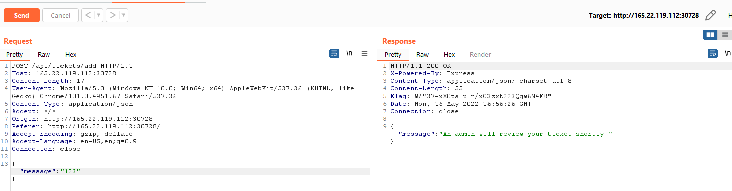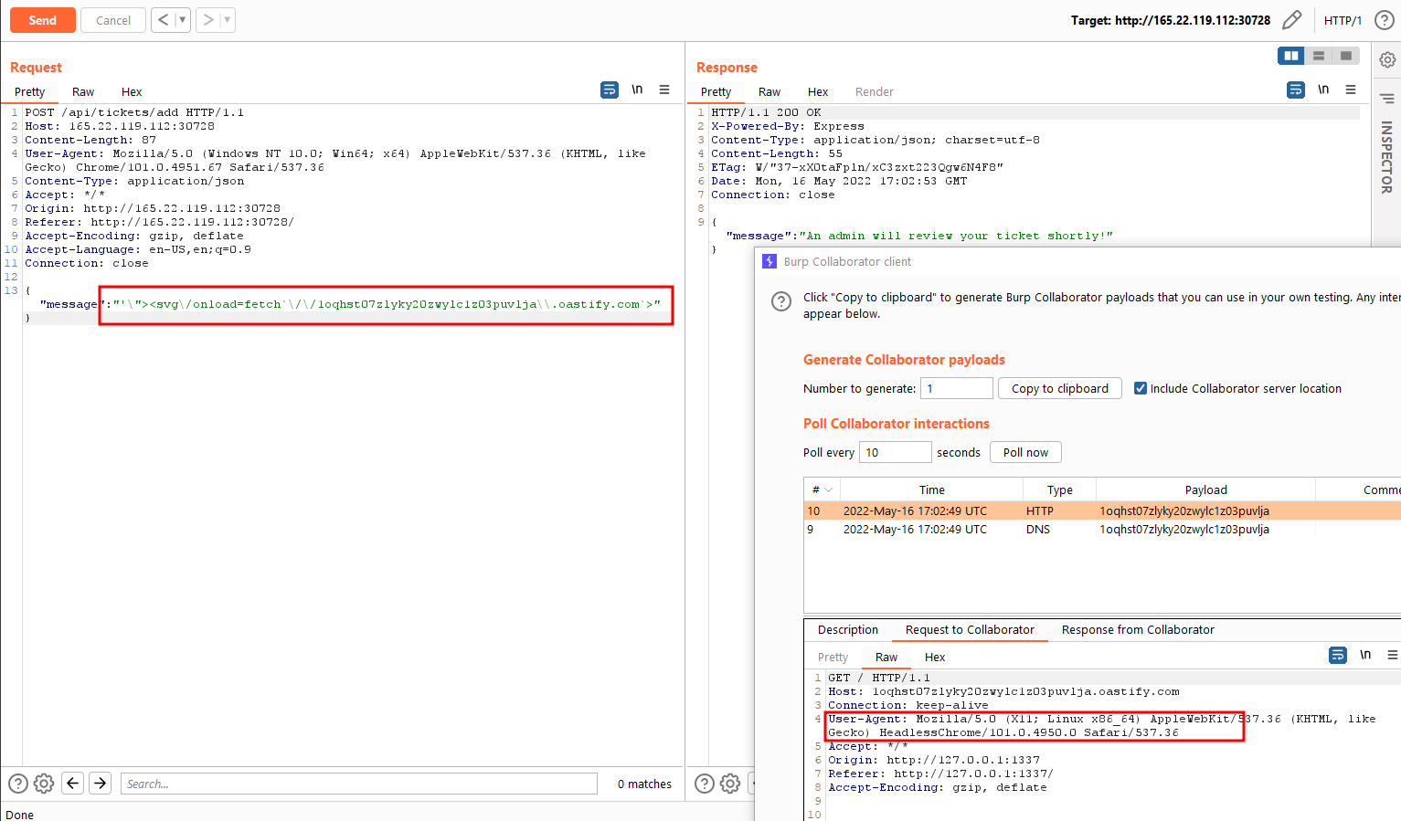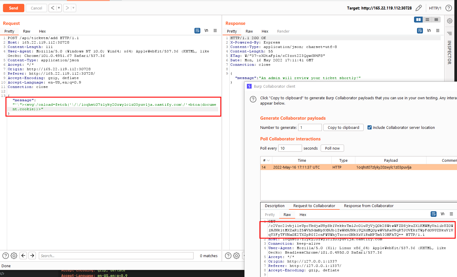 It says that the admin will review the ticket. So it seems like it could be a server-side blind cross-site scripting. Let’s try to get a hit on the burp collaborator using the following payload.