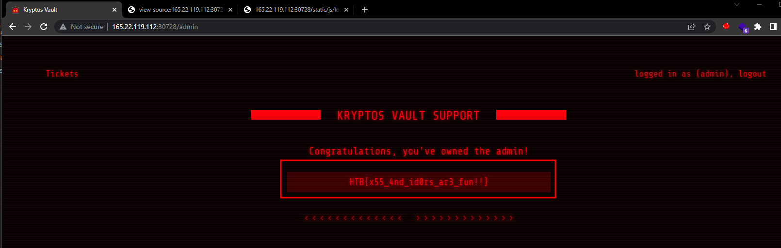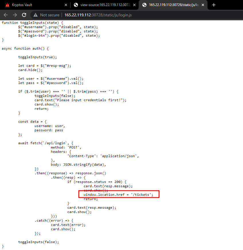 We can use this cookie in our browser. Clicking on the backend link takes us to the login page. So we need to find an authenticated endpoint. Luckily, we see an authenticated endpoint in a JavaScript file. After successful login, it redirects the user to /tickets endpoint.