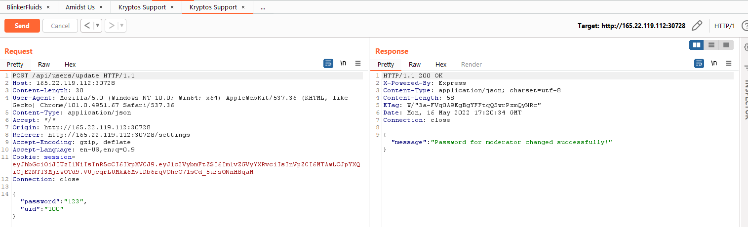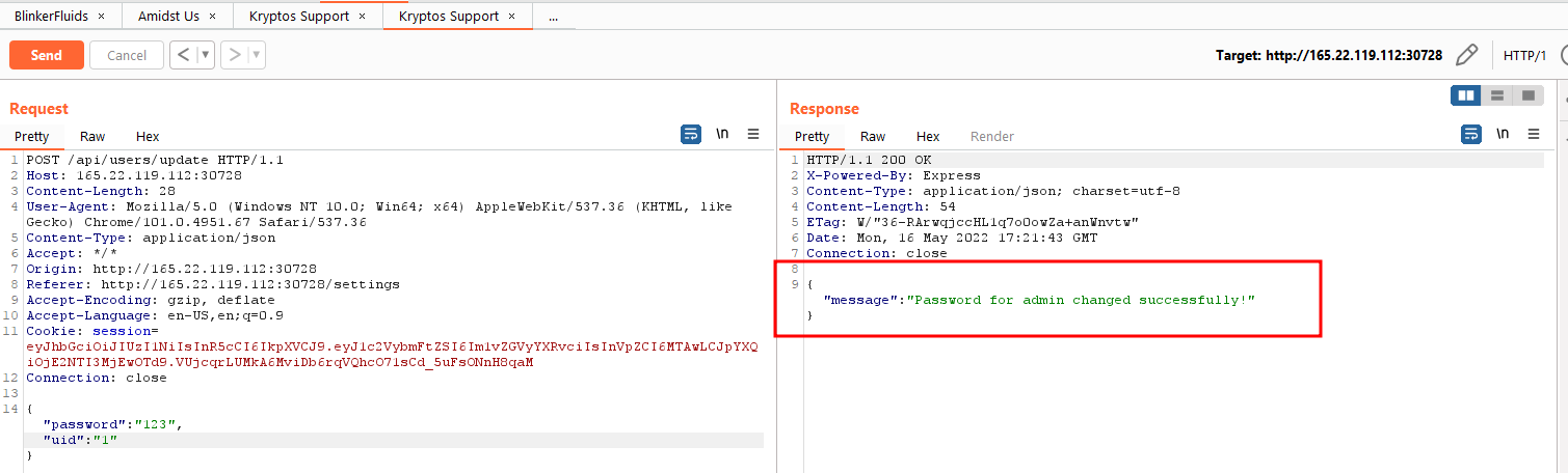 It accepts a uid. There’s probably an IDOR here that would allow us to change the password of the administrator i.e. uid equal to 1. Let’s try.