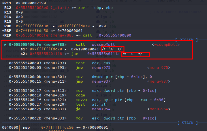 So it’s comparing the first character of our input A with the first character of the actual key s. If we examine the memory address 0x7fffffffdc70, it has our input in sequence.