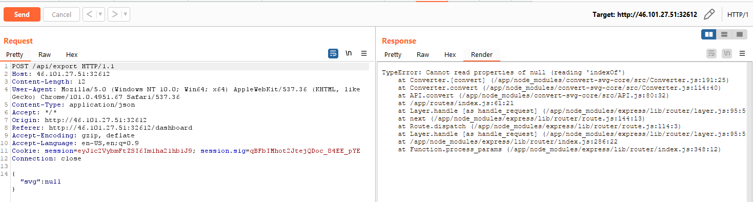 Looking for known exploits, we come across this snyk post. It says that all versions less than 5.0 have an RCE. Apparently, we can inject JavaScript code in the markdown and it would get executed while rendering to PDF. We have the following request to generate the PDF.