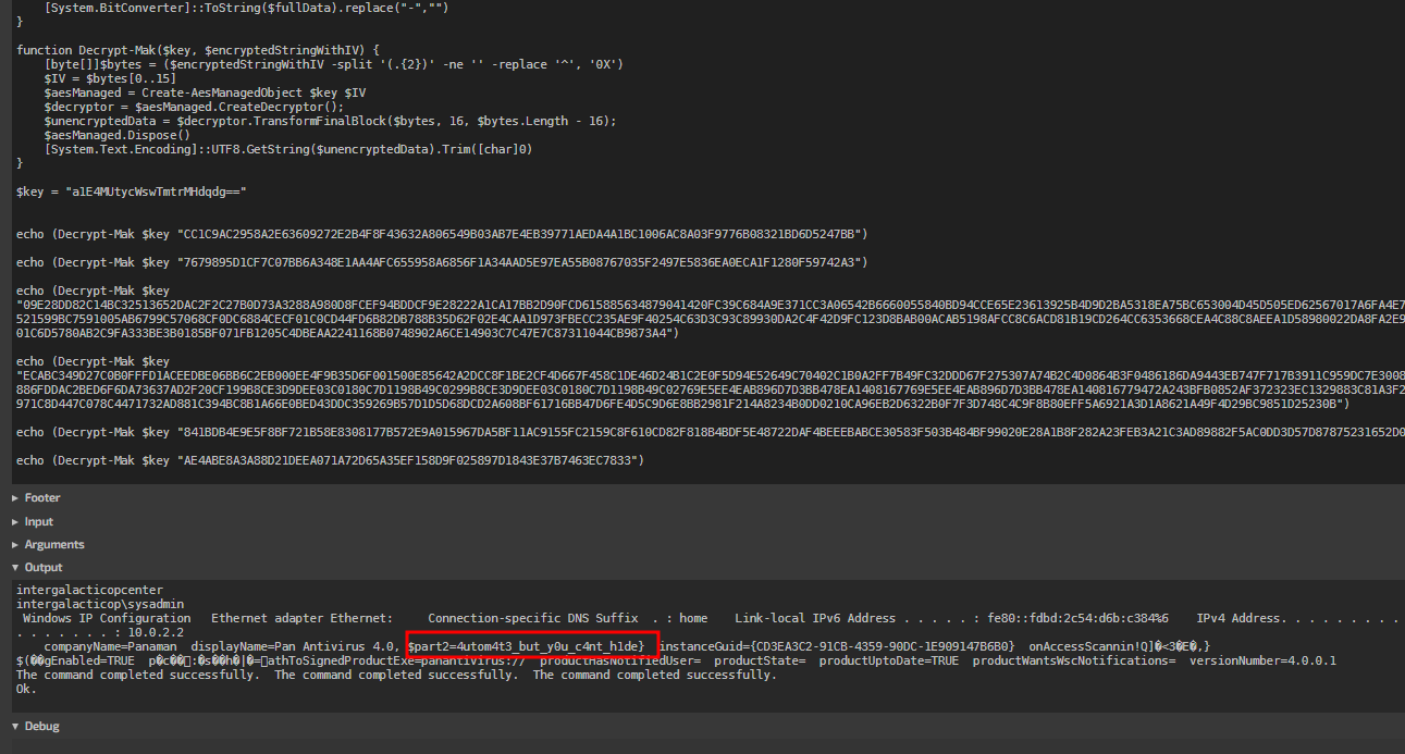 $output = iex $backToPlainText;$pr = Encrypt-String $key $output|parts 32