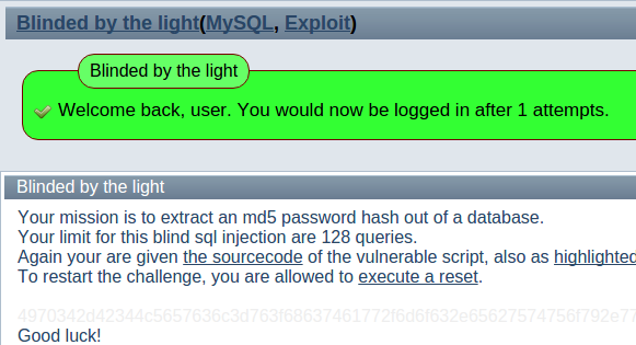 This payload will be executed inside two nested loops. The outer loop will iterate 32 times changing the x in this payload from 1 to 32. This loop represents the length of the MD5 hash. The inner loop will iterate 4 times for each character to extract 4 bits one by one changing y in this payload from 1 to 4. The conv() function in this payload converts a number or a character from one base to another. So, Conv('a', 16, 2) will convert a from base 16 (Hexadecimal) to base 2 (Binary). Another issue here is that MySQL tends to ignore the leading zeros returned by the Conv(). So, Lpad('a', 4, '0') makes sure that we have exactly 4 bits. For example, character 5 will be returned as 101 by Conv(), which may create problems because our inner loop is looking for 4 bits and not 3. So Lpad('101', 4, '0') will add a leading zero to this value and make it 0101 again. The challenge page returns true with the following message.