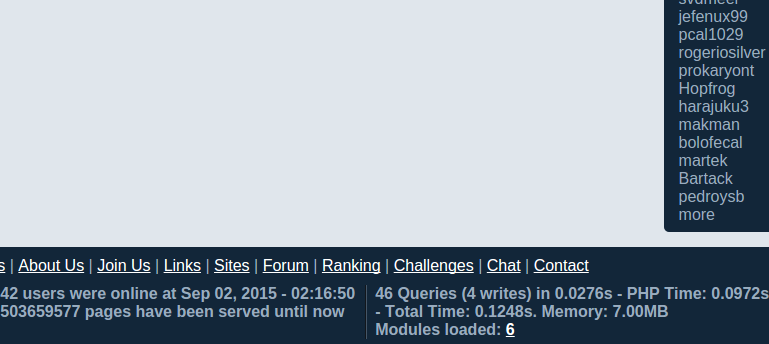 I have realized that I’d have to play with MySQL sleep() function here. For those of you who don’t know, sleep() creates delay for the number of seconds given by the duration argument and pauses the execution. We can actually get one character per query using sleep(). For example, I can ask the database if the first character of the password is a, sleep for 1 second, if it’s b, sleep for 2 seconds, if it’s c, sleep for 3 seconds and so on. And by measuring the execution time we can easily figure out the results. But there’s a reason why people don’t use it. There’s no way we can measure accurate time from the users end unless you have super fast internet with less than 20 ms ping delay from the target (like you’re on the same LAN segment). But luckily, I don’t have to measure the execution time because it’s already given at the bottom of the page. Wechall shows some server side values in the footer of every page like total execution time, number of queries executed, number of modules loaded etc.